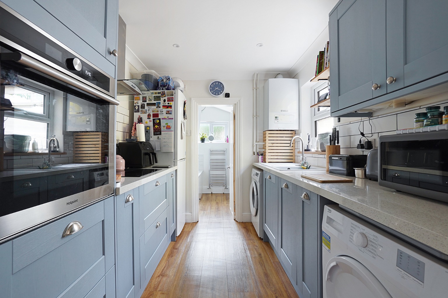 The kitchen, positioned to the rear of the property, overlooks the west-facing garden, allowing plenty of natural light to fill the room. With ample storage and preparation space, it’s perfect for everyday cooking and weekend gatherings alike. The ground-floor bathroom adds convenience to the layout. Upstairs, the home offers three bedrooms, with the third bedroom accessed via the second. This flexible space works beautifully as a nursery, home office, or dressing room, catering to a variety of family needs.